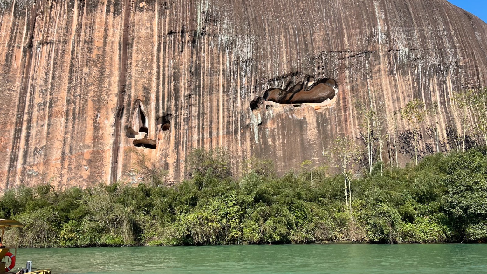 竹筏船沿著光滑壯麗的巖石山緩緩而行,水上丹霞的絕美風(fēng)光如同一幅徐徐展開的長(zhǎng)卷,在我們眼前一一呈現(xiàn)。